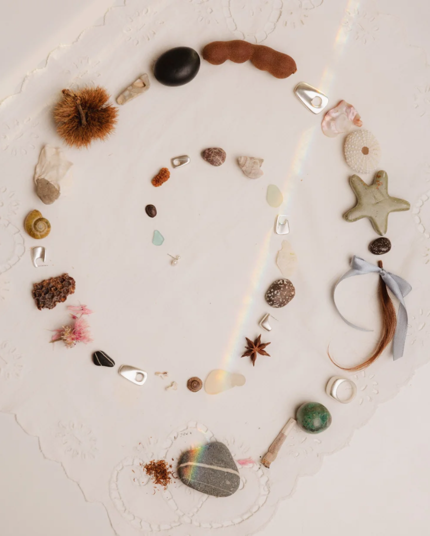 Collection of various small natural objects and stones arranged in a circle on a white doily, with a rainbow light streak crossing through the center.