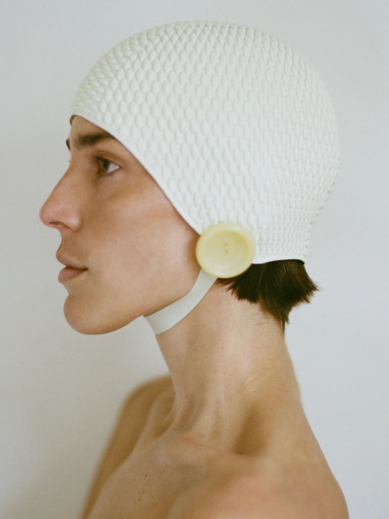 Profile of a woman wearing a textured white cooling cap with an adjustable round knob, looking to the left, against a plain light background.