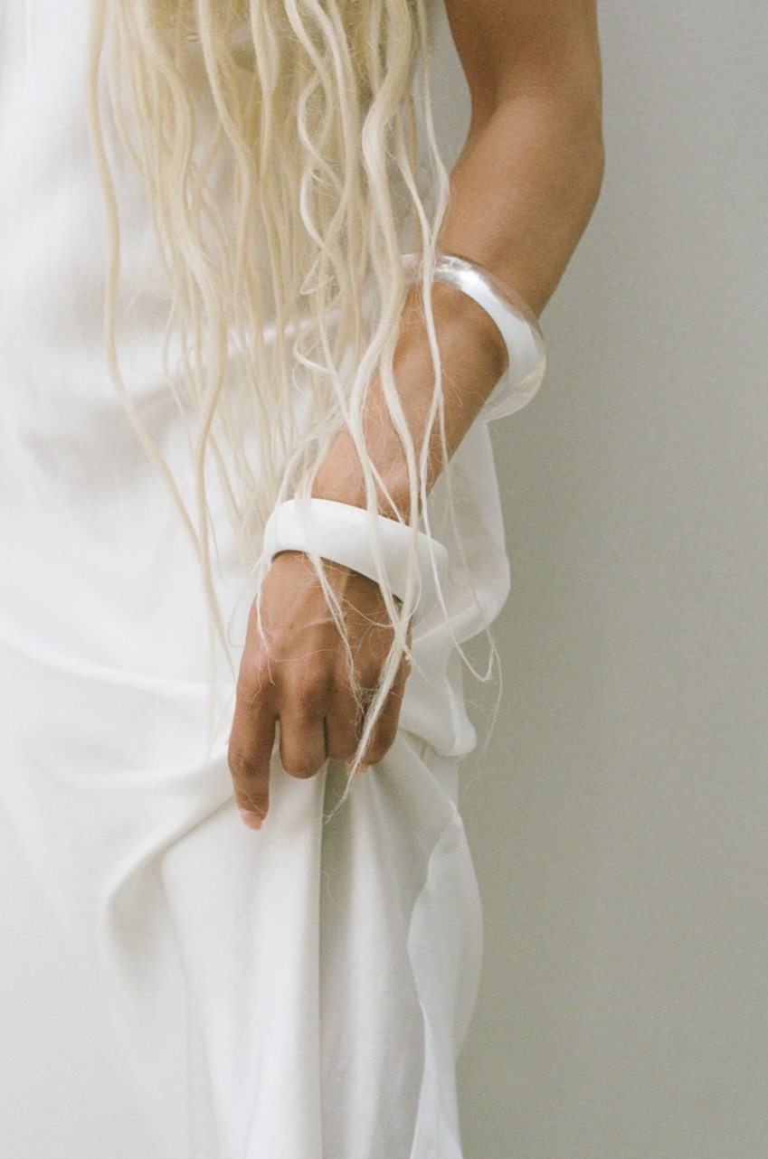 Close-up of a person's hand with long, wavy blonde hair falling over their arm, wearing white jewelry, and holding fabric.